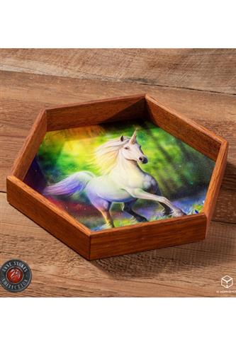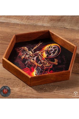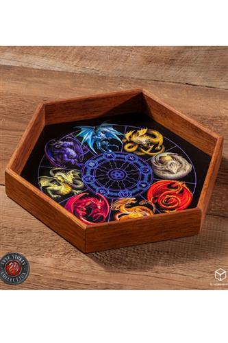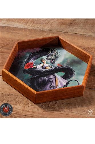 Raflebakke og terningeetui i ét. Raflebakkens låg måler 23,2 cm. fra side til side, etuiet måler 22,2 cm. og selve rafledybet måler 16 cm. Terningerenden er 2 cm. dyb, raflearenaen er 3 cm. dyb og raflebakken med låg er 4,6 cm. høj.