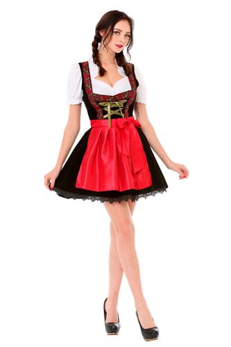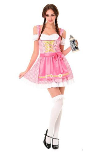 Bier til alle. Som Barpige får du en flot overdel med kortset lignende effekt, der skabes af det fine bånd med knapper. Du får også en sexet sweetheart udskæring samt hvide pufærmer med flæser, hvidt forklæde med en lille kant med snørehuller, lille skørt med lyserød satin og hvid flæsekant, samt en lyserød underkjole.